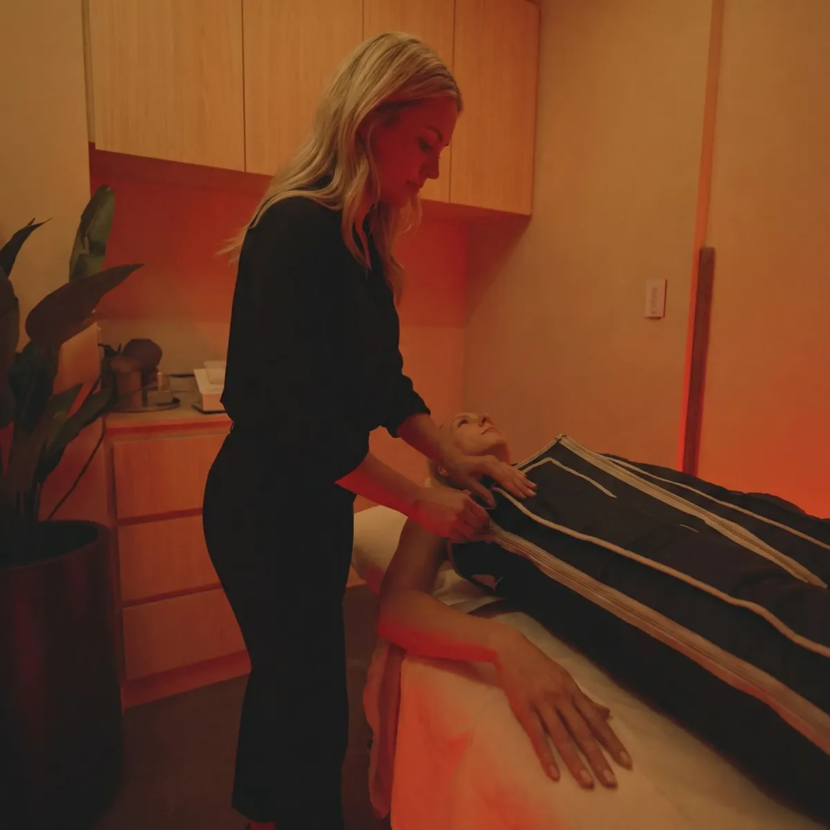 Du välkomnas in i vår lugna oas. Det bästa med BOA Max är enkelheten – du behöver varken duscha, byta om eller förbereda dig på något särskilt sätt. Du tar helt enkelt på dig kompressionsdräkten ovanpå dina kläder och lägger dig tillrätta.